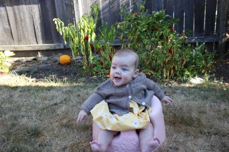 Alaire is 5 months today.  Three weeks into daycare and of course her mellow personality and easy smiles make her everyone’s favorite (I’m sure all the moms say that, but for us it’s true!).  Each day, Miss Andrea tells me, she’s such a doll!  This month, we battled our first real sick germs including a bad head cold and the dreaded ear infection, but we chalk it up to the fact that we will build important immunities.  Alaire now rolls back to front with ease, front to back is still a bit hard.  Last Wednesday we ceased with the swaddling because she broke my swaddles (an impossible task up until now), now she sleeps snuggled up in sleep sacks.  Without the restriction of the swaddle, she wakes up a few times a night to chit-chat, but we know she will get comfortable with her new found freedom and resume her 12 hour sleeps.  We do find her in all kinds of strange positions in her crib.  My favorite so far was finding her feet poking out of the crib rails, using the night- stand as a foot rest.  I love this 5 month stage of giggles, babbling, snuggling (my girl loves to snuggle when you hold her close) and seeing the joy and recognition in her eyes when she sees her mommy and daddy.