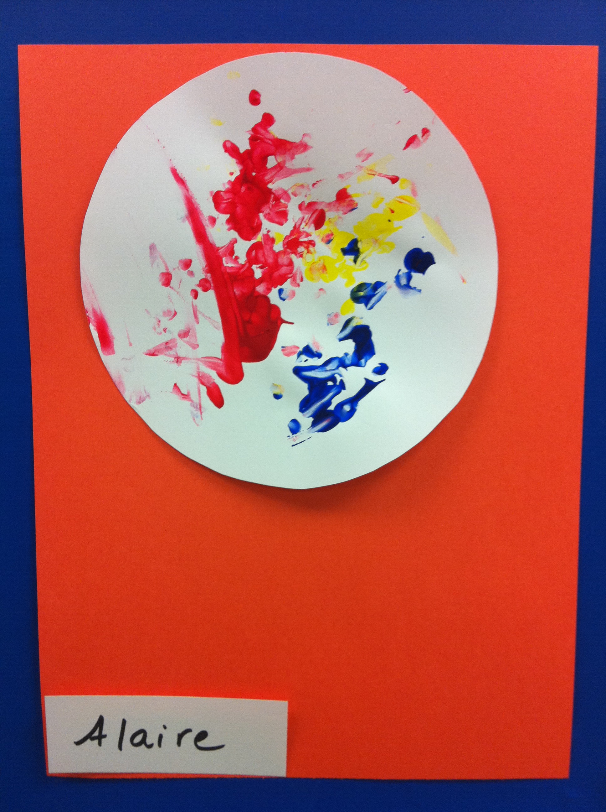 This is Alaire’s very first art project! YAYYYYYYY! Who says 5 month old babies can’t finger paint? I cracked up today when my new friend Melissa, mom of Alaire’s boyfriend Wattson, looked at her son’s painting and said, Oh Wattson! Your painting looks angry! What can we say? We’re already disturbing our children! I’m pretty sure Alaire will hate me for the Poo Chronicles! I’ll have to amend this post tomorrow with a photo of Wattson’s painting. I think Alaire is already showing the crafty talents of both her Grandmas and her Aunt Larisa!
