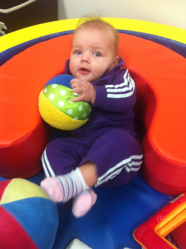 Today I left “Sporty Spice” (Miss Andrea’s term of endearment for Alaire today) in the ball pit. While it looks like she is simply interested in chewing on the balls, she actually kicked them like a pro! A good thing because her Dad already told her she is going to play soccer in school.