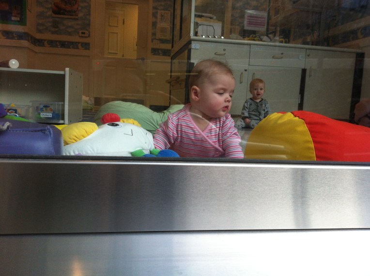 The “Infant 2” room at daycare, where Alaire spends late afternoons with Miss Meggie (after Miss Andrea leaves) has a huge window that looks onto 5th avenue, one of the busier financial districts streets in downtown. Positively, the sweet little kindercare babes zap the grumpy, stressed-out bankers, lawyers, and accountants into happy-land as they pass by. On Thursday, my little baby enjoyed tummy-time at the window. I tapped, curious to see if she would recognize her ridiculous mommy, waving, clapping and jumping frantically outside the window. Turns out she did! And rewarded me with a big happy Alaire smile!