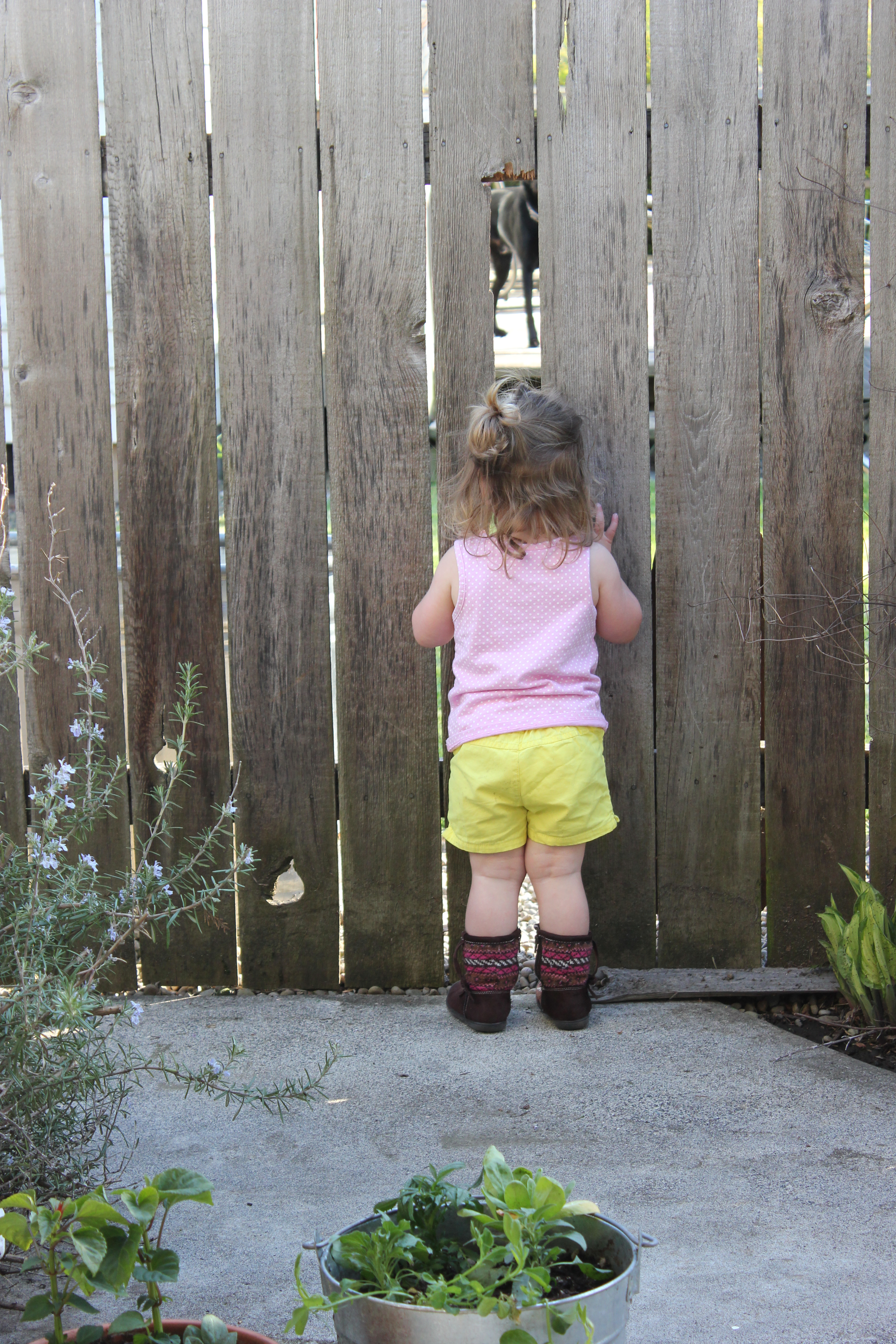We now have a new fence, but for a few weekends, one of Alaire’s favorite past-times was spying on the neighbors. Not really, she loved to watch our next door doggy, Porter. She also insisted on wearing boots with her shorts. What a raggamuffin.
