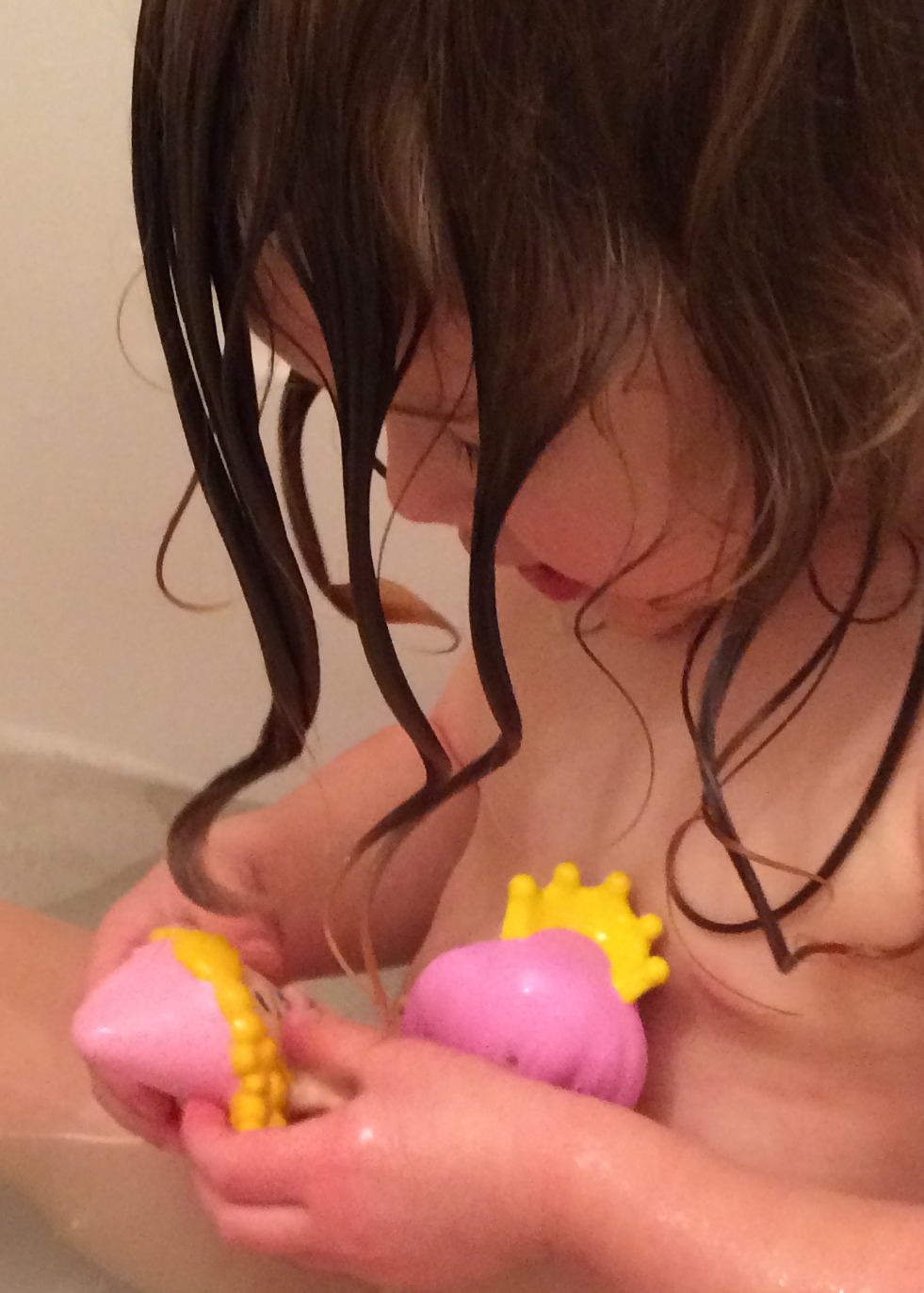 I walked into the bathroom to see how Alaire’s evening bath was progressing and Graham informs me that one of the mermaids is in time out for hitting the other mermaid! Alaire asked the offending Mermaid, “Do you understand why you are in time out,” “Do you understand?” Then she explains that the Mermaid is crying and says “I’m sorry,” to the other mermaid. Then the mermaids played.