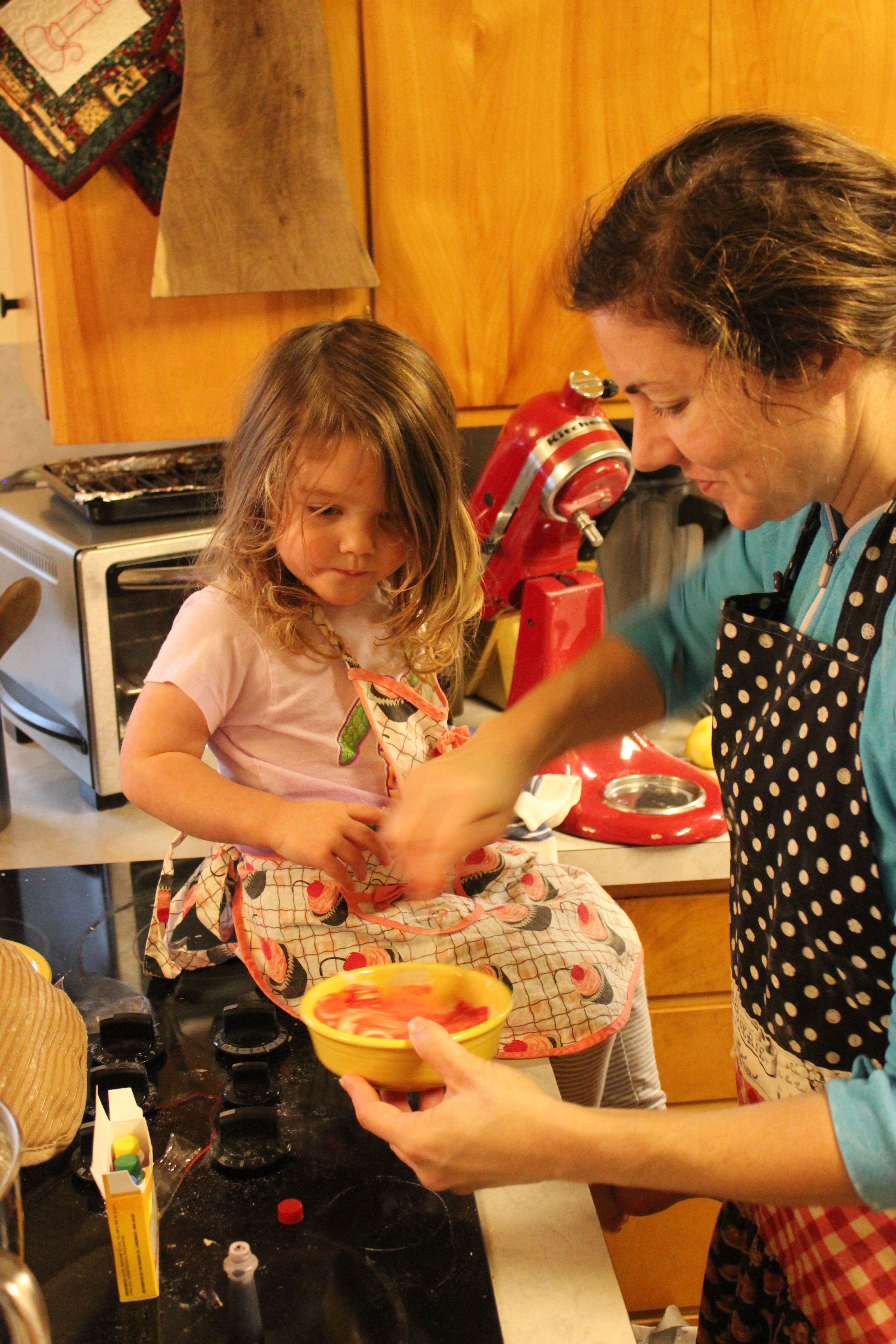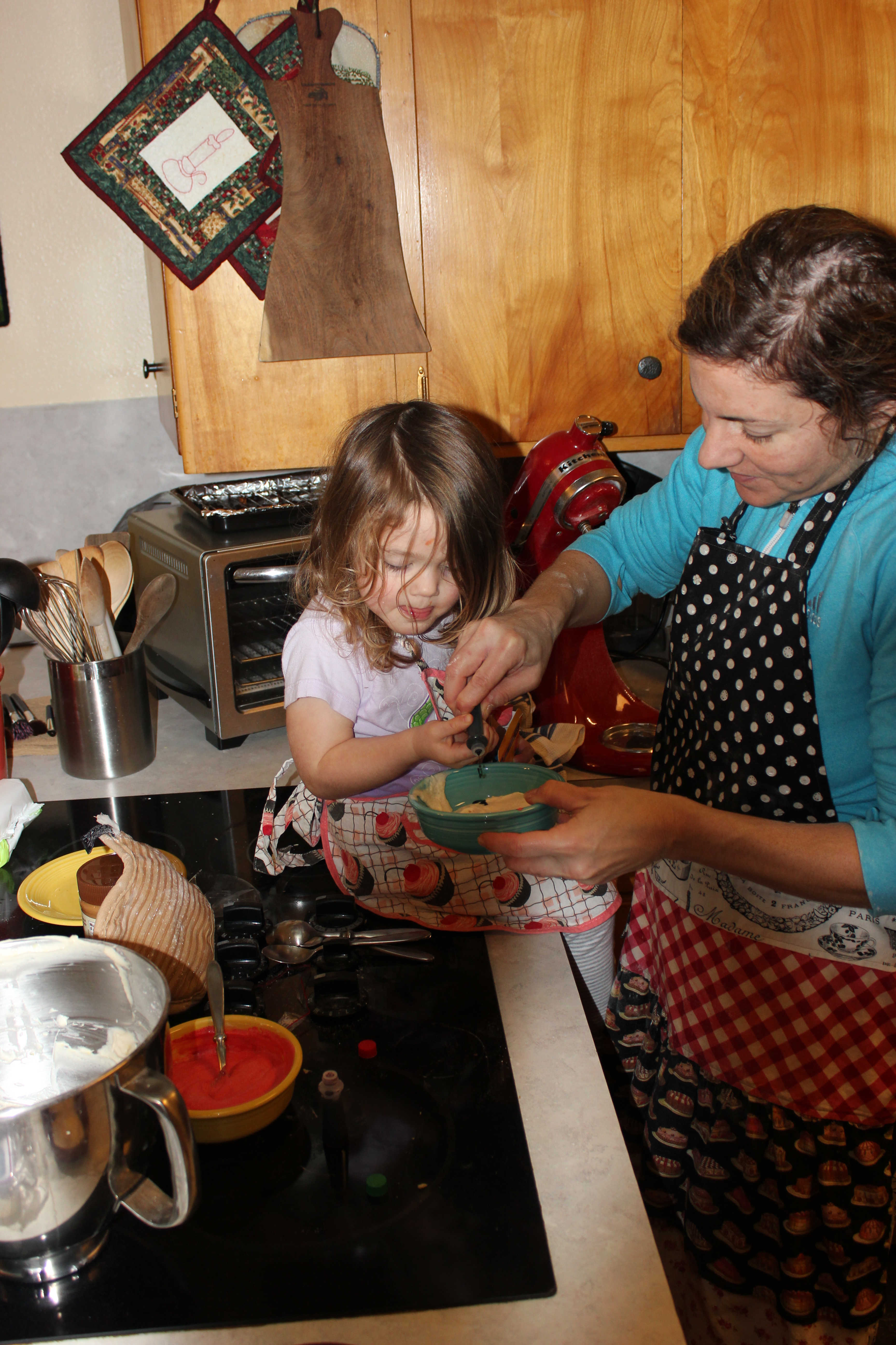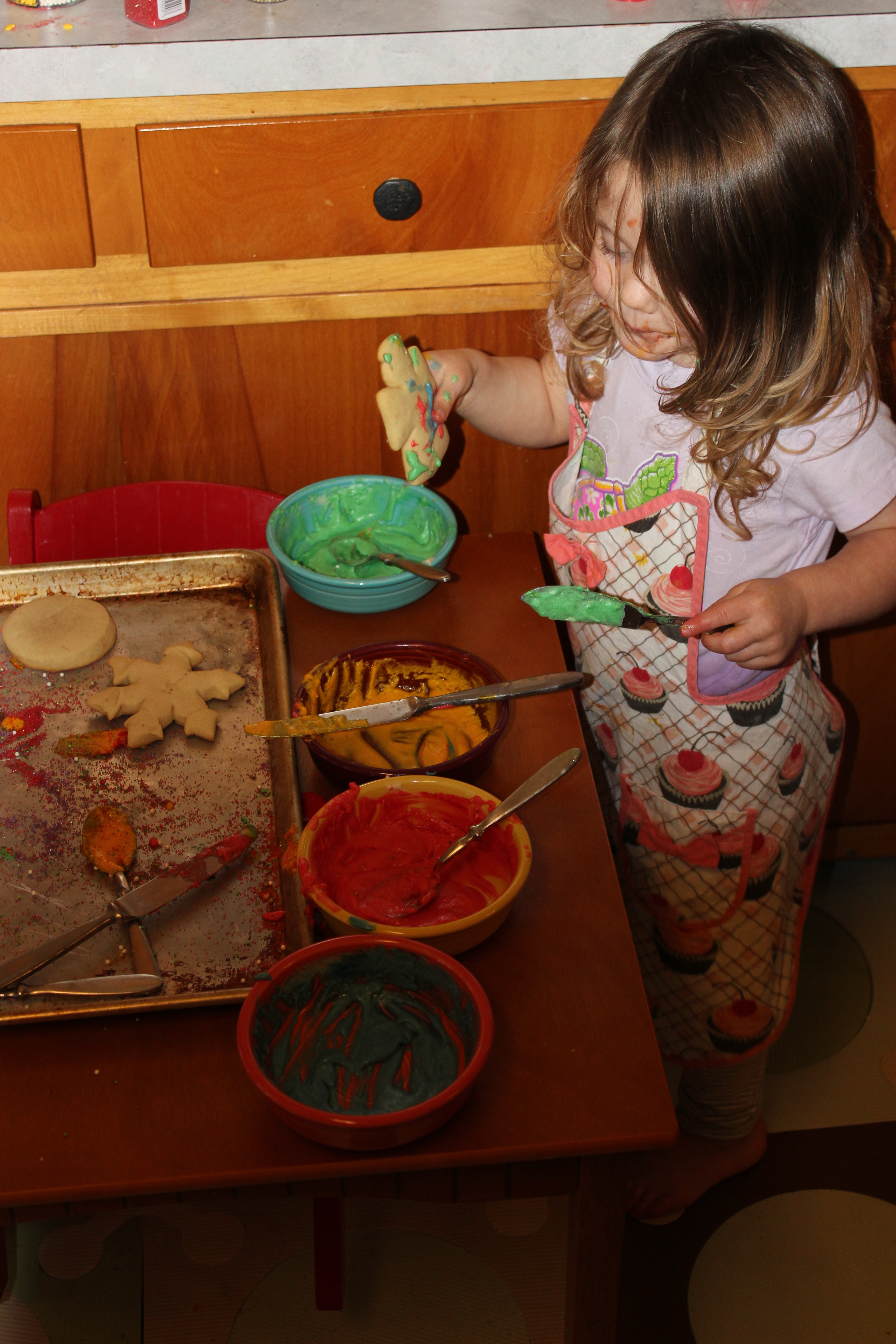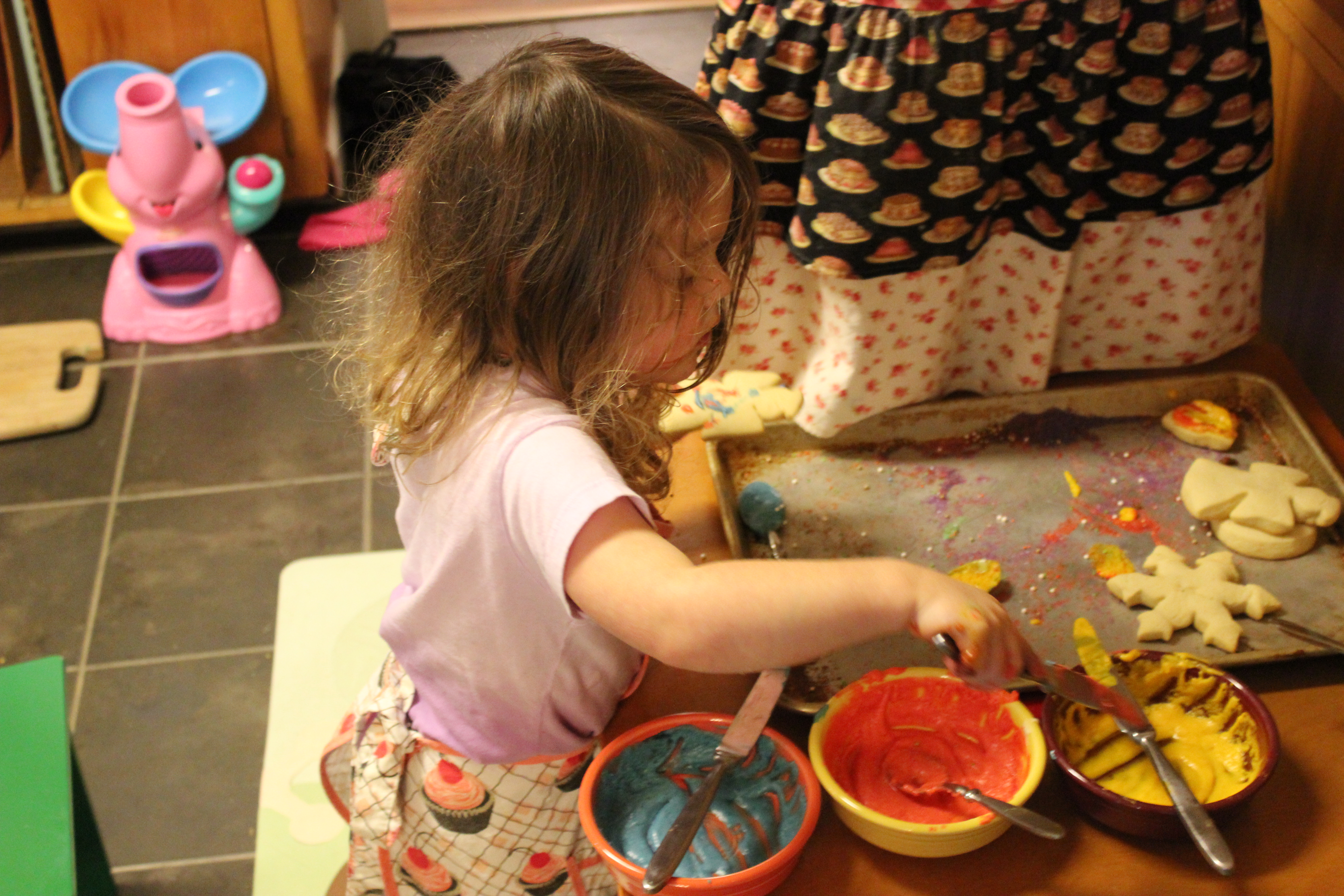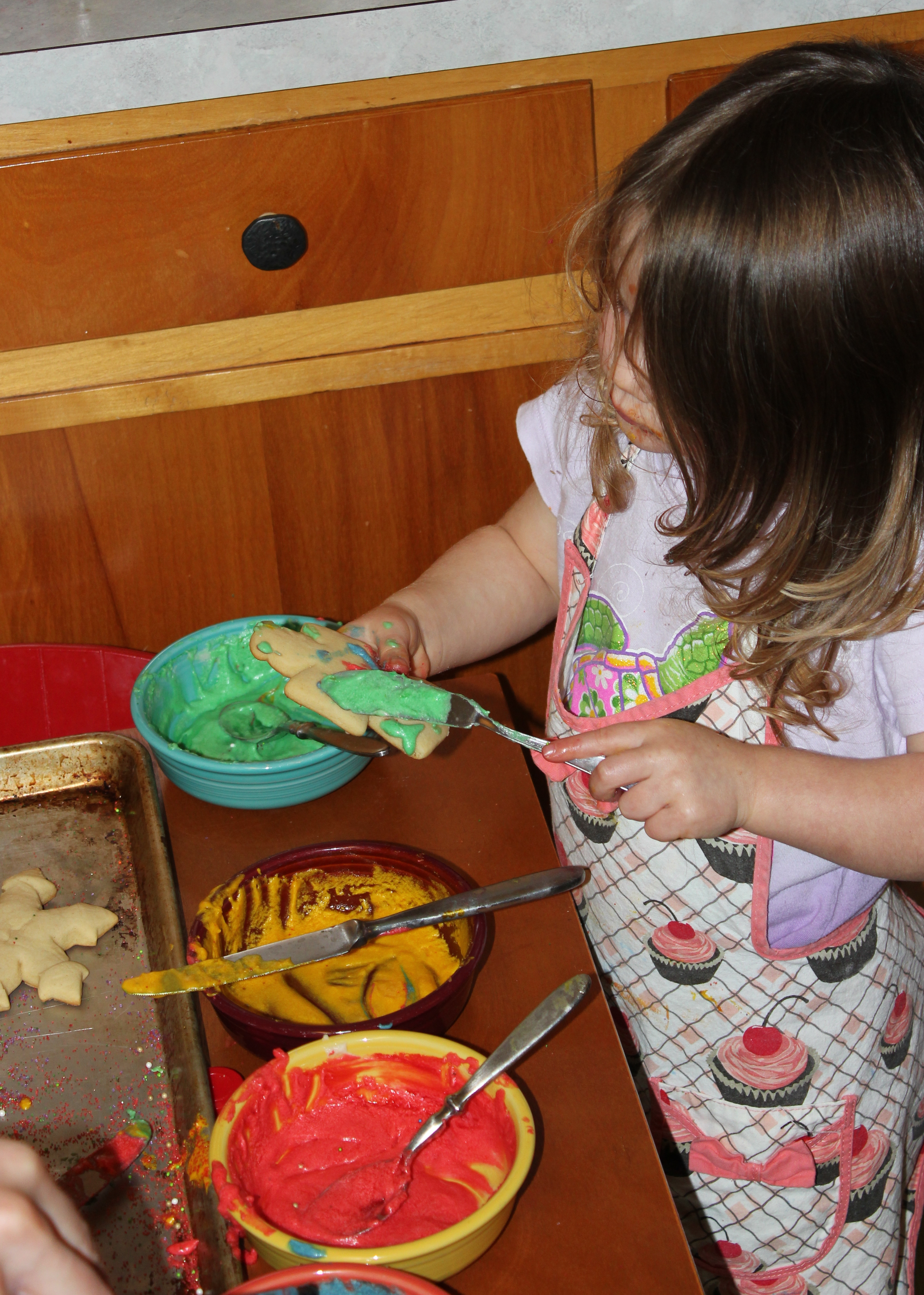 While we baked our cookies, we mixed up our frosting with food coloring – she handled the frosting pigment (the yellow is really borderline orange with half the bottle coming out in one ambitious squeeze).