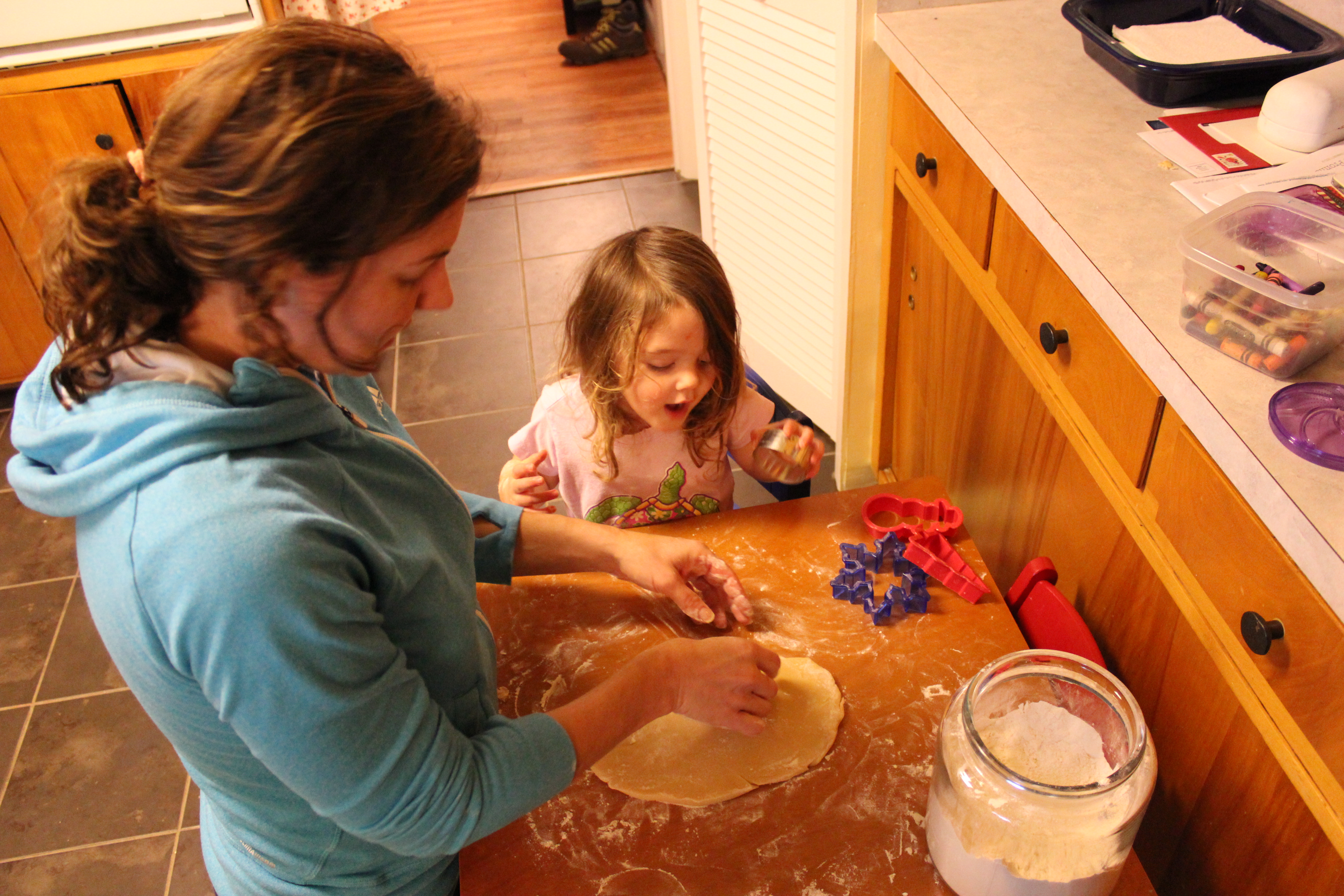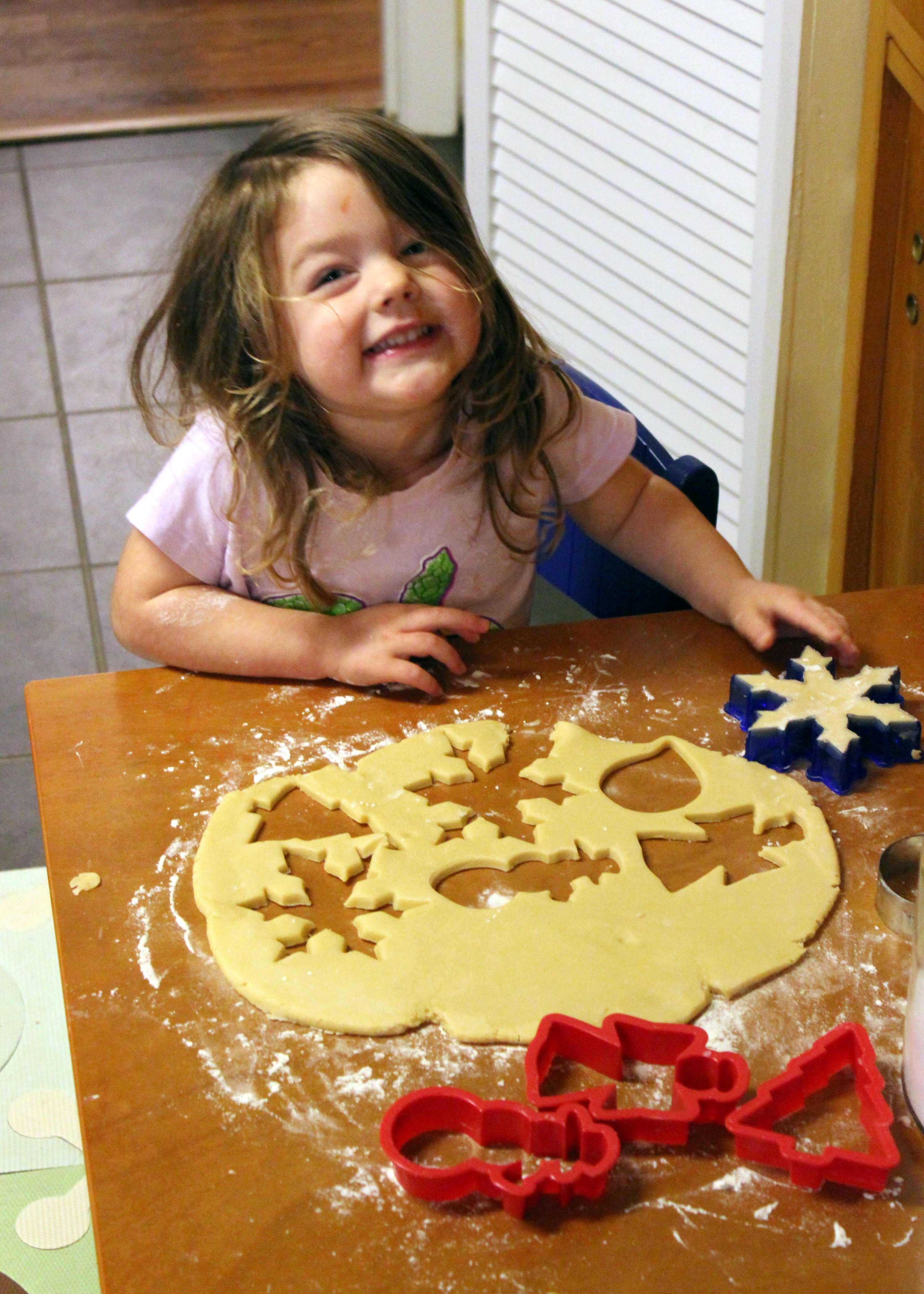 We rolled out the dough…and I showed her how to position and press the cookie cutters. With patience being a tall order for a toddler, Alaire was cuttin’ cookies faster then I could put them on the cookie sheet resulting in some angels missing wings and trees missing branches, C’est la Vie!