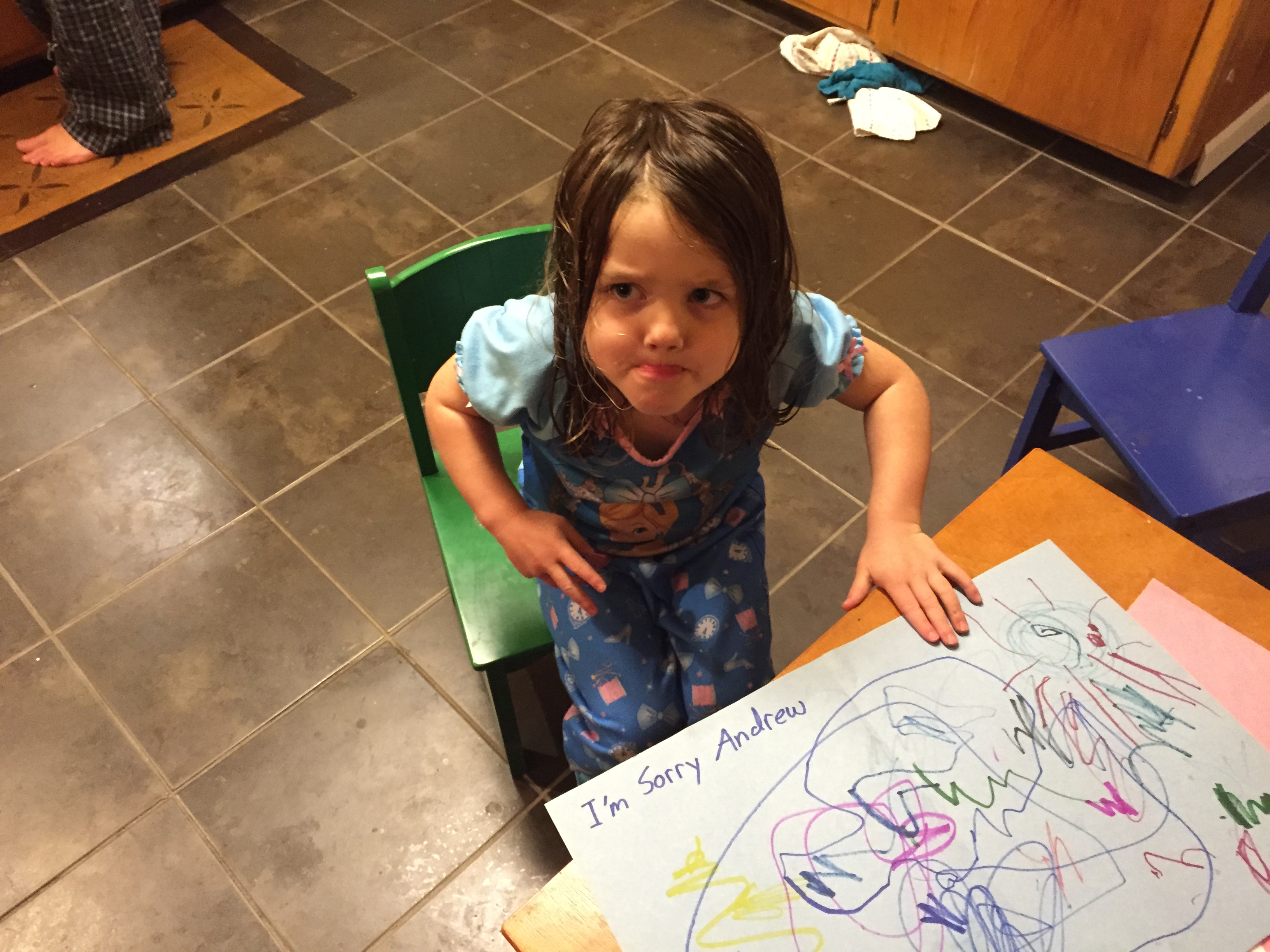 Here’s Alaire suffering part of her punishment, drawing Andrew an apology picture.